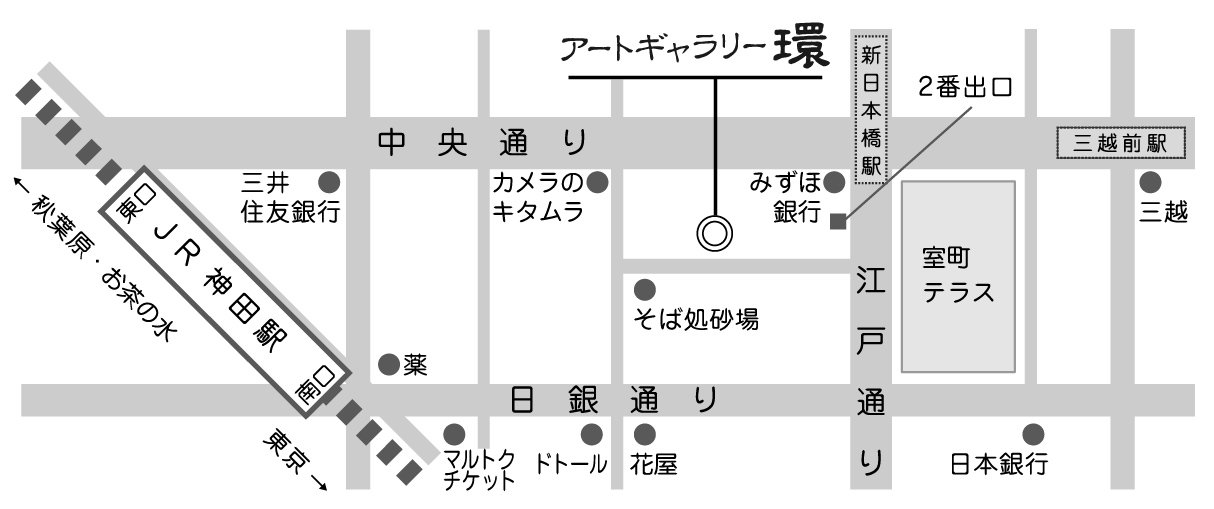 ・地下鉄三越前駅下車。JR線方面改札を出て地下道を直進(JR新日本橋方向)、つきあたりを左折し、日本橋室町4丁目(2番)出口より徒歩3〜4分